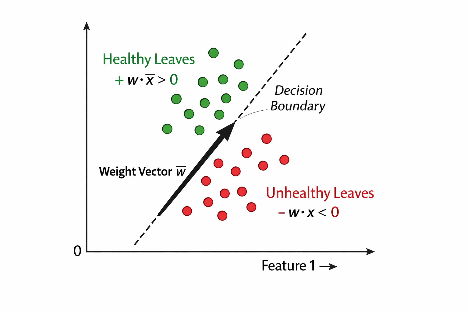 Imagine a problem where we want to classify whether a leaf is healthy or diseased based on certain features. Each leaf is represented as a feature vector in a two-dimensional space (for simplicity).